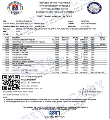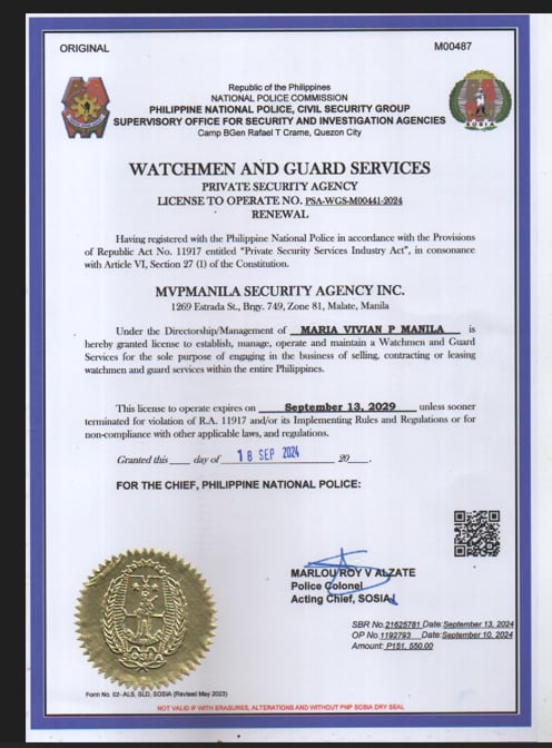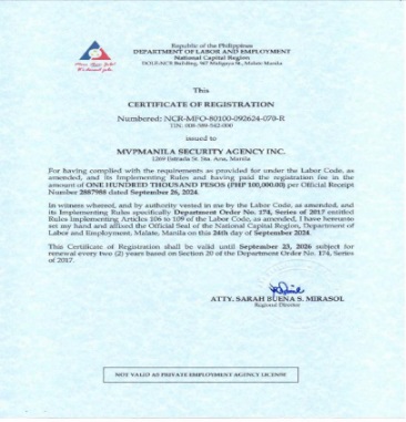 Like any other businesses, MVPMANILA SECURITY AGENCY INC (MVPMSAI) strictly complies with all government mandated business permits, licenses, registrations, certifications and memberships such as: